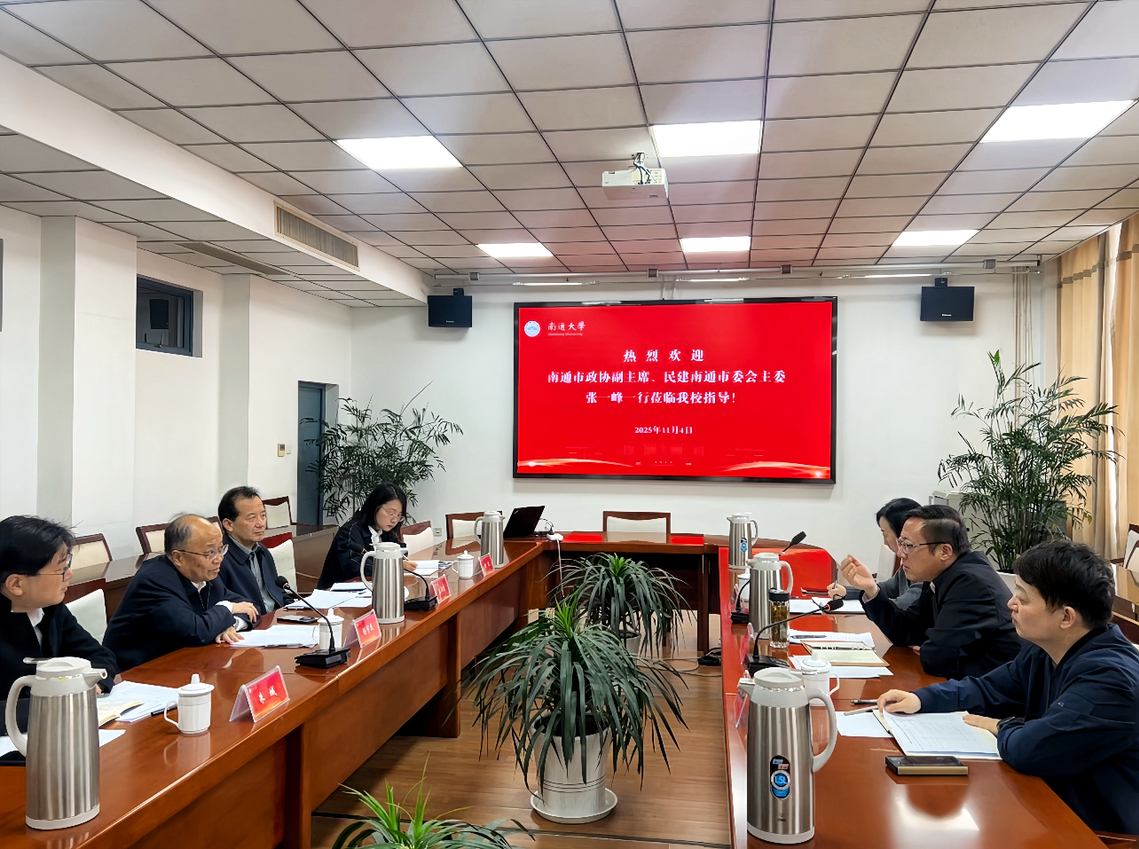 11月4日,南通市政协副主席、民建市委会主委张一峰一行来校交流。校党委书记杨宇民,校党委副书记王卫东,校党委常委、统战部部长朱城出席座谈会。
