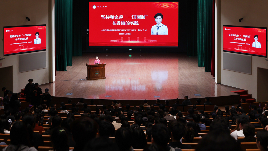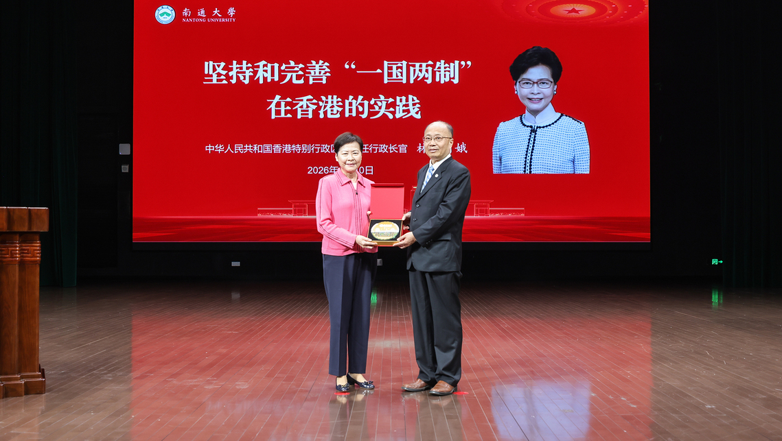 4月10日,香港特别行政区第五任行政长官、江苏省香港商会荣誉会长、江苏省海外联谊会荣誉会长林郑月娥来校访问,以“坚持和完善‘一国两制’在香港的实践”为题作主旨演讲。校党委书记杨宇民在活动中致辞,并向林郑月娥赠送学校纪念品。校党委副书记王卫东主持活动。江苏省政协常委、江苏省香港商会会长施伟斌,以及香港经贸考察团成员出席活动。